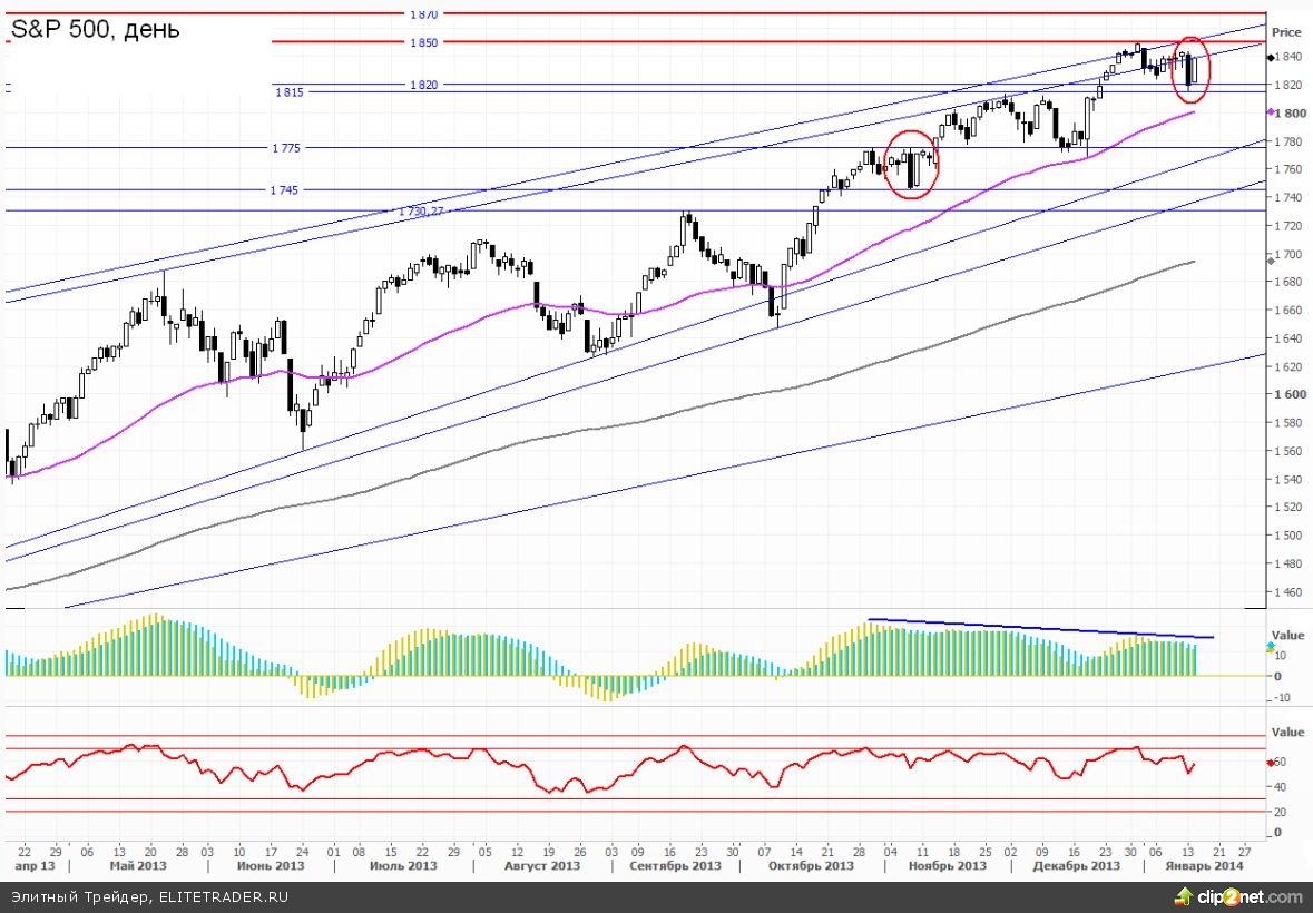 За океаном вчера мы были свидетелями увлекательных маневров, которые по-настоящему стали уже привычными. Поспешно сделанные предположения о сломе тенденции оказались ошибочными. В прошлую пятницу индекс S&P 500 заметно просел и достиг ключевого уровня 1815, нарисовав тем самым очень многообещающую разворотную дневную свечу. Однако, как это уже было в ноябре, на следующий же день быкам удалось полностью выкупить практически все снижение, нивелировав медвежий потенциал. В прошлый раз вся эта история закончилась тем, что котировки вновь продолжили свое движение в рамках восходящего канала и обновили исторические максимумы. В связи с этим и сейчас у нас есть основания рассчитывать на реализацию подобного сценария. Тем более что согласно ранее сделанным нами прогнозам, максимальный потенциал роста индекса S&P 500 пока еще не реализован. Напомню, что мы выделяли отметки 1850 и 1870-1875 в качестве ориентиров, после достижения которых нас ждет полномасштабная коррекция. Уровень 1850 к текущему моменту мы уже протестировали (31 декабря). Цель на 1870-1875 станет актуальной уже в случае роста выше 1845.