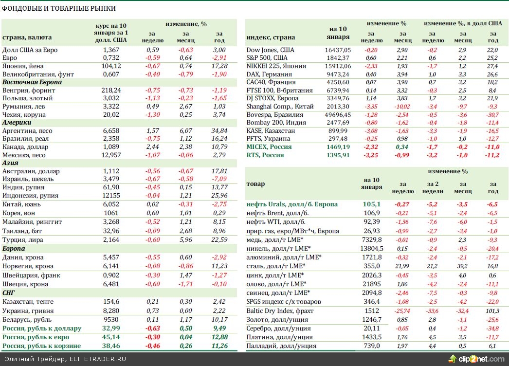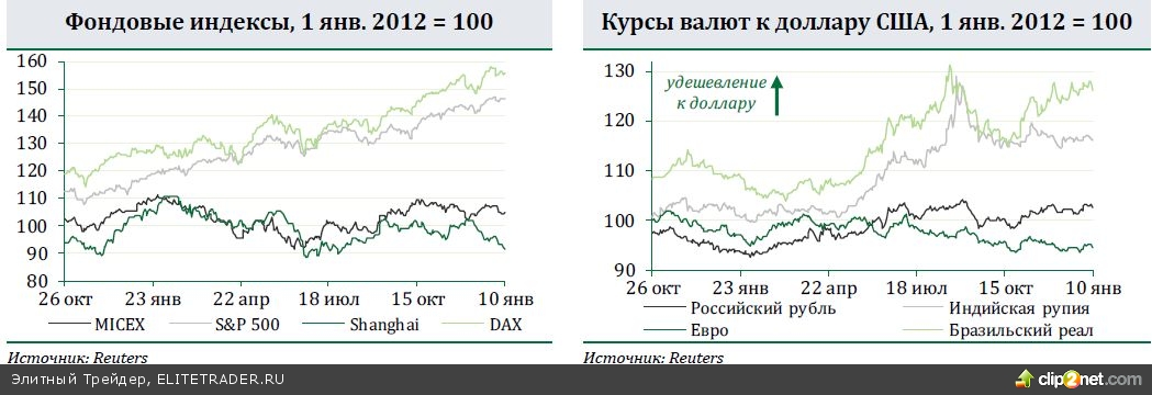 На большинстве фондовых рынков в новом году наблюдается сдержанный пессимизм. Лучше других выглядят фондовые индексы США, опирающиеся на поток хороших экономических новостей. Эти же новости внушают инвесторам на других рынках опасения, что ужесточение политики ФРС приближается. Худшим показателем в общей картине традиционно для последнего времени остается китайский фондовый рынок (минус 3,4% за неделю по индексу Shanghai Composite). Народный Банк Китая продолжает настаивать на своей жесткой политике, невзирая на опасность кризиса ликвидности и общее неуверенное состояние банковской системы. Российские биржевые индексы на неделе снижались вслед за преобладающим трендом на развивающихся рынках. Рублевый индекс ММВБ потерял 2,3%, а долларовый индекс РТС снизился на 3,2%. Российская валюта за неделю подорожала на 0,6% к доллару США (до 32,99 рублей за доллар), а к евро рубль подорожал на 0,3% (до 45,14 рублей за евро).