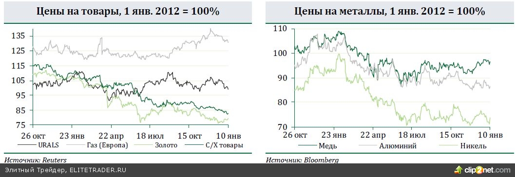 На товарных рынках с начала года наблюдается пессимизм, обусловленный опасениями дальнейшего ужесточения денежной политики ФРС, а также торможением роста в Китае. Подавляющее большинство биржевых товаров с начала года снизились в цене на 2-7%. Прибавили только драгоценные металлы. Правда, последний день этой недели ознаменовался некоторым отскоком цен на сырьевые товары, после того как Китай опубликовал торговую статистику за декабрь, зафиксировавшую рекордные объемы импорта энергетических товаров и руды. Нефть URALS снизилась за неделю на 0,3% до 105,1 доллара за баррель. По информации Reuters, Россия и Иран обсуждают соглашение, которое позволит Ирану продавать нефть в обход санкций США и Евросоюза в обмен на российские товары. Цитируются объемы в 500 тыс. баррелей в день – это +50% к текущему экспорту нефти Ирана и около 1,5 млрд долл. в месяц. Цена на никель резко выросла в конце недели, из-за того что Индонезия задержала в своих портах китайские сухогрузы. С 12 января страна вводит запрет на экспорт никелевой руды, чтобы поддержать местную металлургию. По оценке Bloomberg, руда из Индонезии покрывает более 60% потребления никеля в Китае.