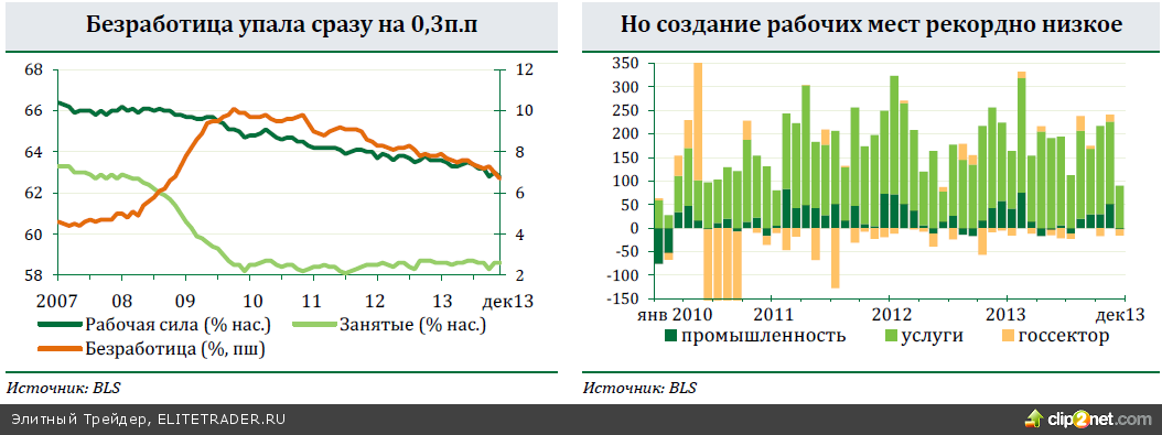 Доклад о состоянии рынка труда удивил противоречивостью показателей. Все привыкли к тому, что уровень безработицы в последнее время устойчиво снижается, хотя и не всегда по позитивным причинам. Тем не менее, никто не ожидал снижения сразу на 0,3 п.п. до 6,7%. Прогнозы рынка давали повторение ноябрьских 7,0%. ФРС на последнем заседании понизила с 6,5% до 6% свой декларируемый порог уровня безработицы, после которого, при условии низкой инфляции, могут начаться дискусии о повышении ставок. Однако если безработица продолжит снижаться такими темпами, ФРС скоро снова придется говорить о недостаточной показательности уровня безработицы для оценки состояния рынка труда. Аналитики Economic Policy Institute взяли докризисные доли участия в рабочей силе по разным возрастным группам за базу и сделали поправки на текущую демографическую ситуацию, чтобы учесть людей, прекративших поиски работы. По их оценкам текущий реальный уровень безработицы остается высоким на 10,2%. Доля рабочей силы в населении снова упала до 35-летнего минимума в 62,8%. Другая проблема, вскрывшаяся в декабрьском отчете, очень низкое количество созданных рабочих мест, всего 74 тысячи при прогнозах рынка в 196 тыс. Это рекордно низкий показатель с января 2011 года. После 200+ тыс двух предыдущих месяцев нужно признать серьезное замедление. Часть его, но не все, объясняется очень холодной погодой в США – строительный сектор, например, потерял в декабре 13 тыс рабочих мест, после среднего роста +10 тыс. в предыдущие месяцы года. Объемы строительства в ноябре выросли на 1,0%мм за счёт частного сектора, как коммерческого (2,7%мм), так и жилищного (1,9%мм) строительства. В госсекторе снижение на 1,8%мм.