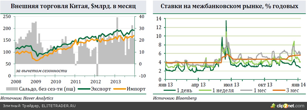 Межбанковский рынок, видимо, останется под давлением и в 2014 году. В последнюю неделю перед новым годом НБК, стремясь успокоить ситуацию на межбанке, где снова подпрыгнули ставки, предоставил 300 млрд юаней краткосрочной ликвидности нескольким крупным банкам. Сейчас краткосрочные ставки заметно успокоились, но в среднесрочных - с ноября наблюдается устойчивая тенденция к повышению. Несмотря на экстренные вливания в июне и декабре, суммарно за 2013 год НБК ввел на рынок всего 115 млрд юаней, сопровождая свои действия призывами к банкам «наладить свой менеджмент ликвидности». Несмотря на отсутствие публичных официальных директив, нынешняя политика НБК однозначно трактуется как принуждение банков к делевериджингу и снижению рисков. Инфляция в декабре снизилась до 2,5%гг после 3,0% ноября. Главный вклад традиционно внесла продовольственная компонента, снизившаяся до 4,1%гг. Базовая инфляция при этом осталась на уровне 1,7%гг. Цены производителей снизились в декабре на 1,4%гг, показатель остался на ноябрьском уровне. Баланс внешней торговли в декабре снизился до 25,6 млрд долл. после 33,8 млрд долл. ноября. Экспорт вырос на 4,3%гг, импорт прибавил 8,3%, прогнозы рынка давали по 5% роста каждому показателю. После рекордного профицита ноября декабрь мало чем примечателен. В 2013 году в целом экспорт Китая в долларах США вырос на 7,9%, а импорт – на 7,3% по сравнению с предыдущим годом.