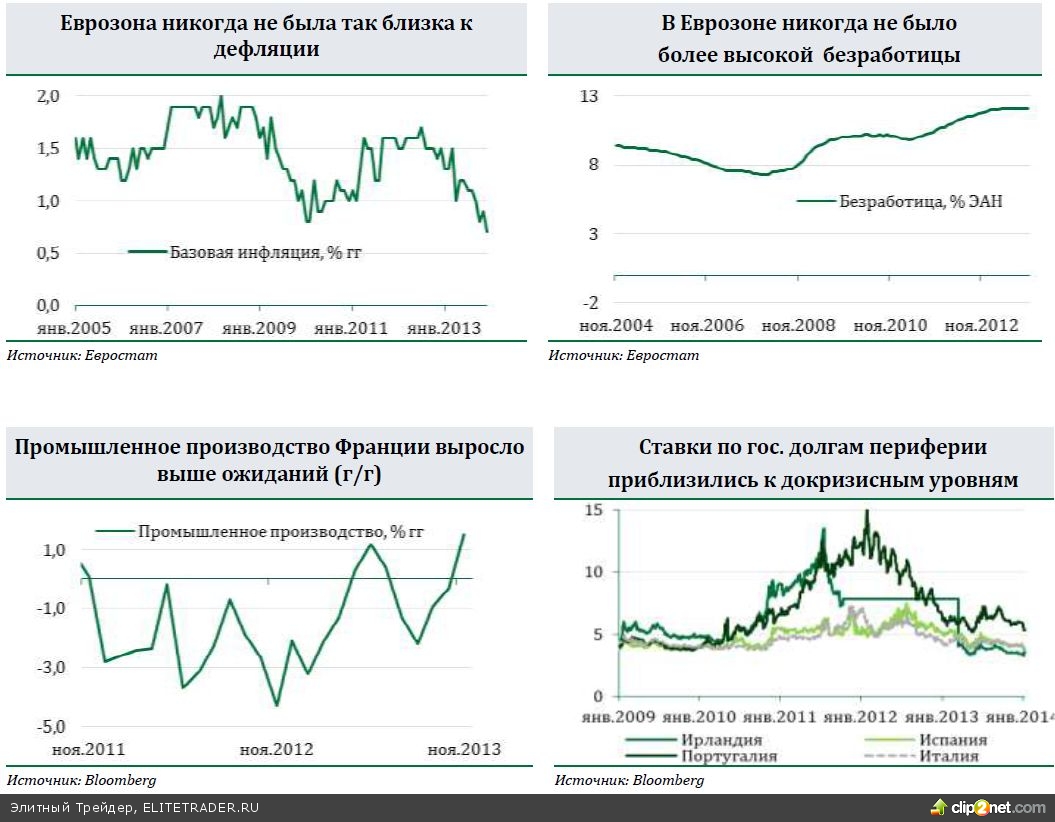 Несмотря на приближение инфляции к дефляционному порогу, ЕЦБ предпочёл оставить ставку без изменений на установленном в ноябре уровне 0,25%, пообещав использовать «все возможные инструменты» при ухудшении ситуации. С учётом половинчатого решения по банковскому союзу Еврозоны мы верим Марио Драги и считаем, что в негативном сценарии ЕЦБ пойдёт и на снижение ставки, и на покупку государственных облигаций через механизм OMT. В целом, январские новости говорят о том, что, несмотря на сохраняющиеся риски, 2014 год вполне может стать чертой, после которой власти Еврозоны смогут сказать, что «самое страшное осталось позади».