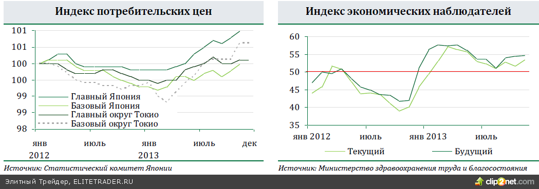 На очередном заседании Банка Японии в конце декабря было решено продолжить увеличение денежной базы со скоростью 60-70 трлн иен в год. Банк Японии ожидает ускорения инфляции в следующем месяце, а также отмечает рост инфляционных ожиданий. Тем временем, рост цен в ноябре оказался максимальным за 5 лет: инфляция достигла 1,2%гг (+0,2%мм). Рост индекса потребительских цен за вычетом цен на продукты питания и энергию в ноябре составил 0,6%гг (+0,2%мм). В декабре прирост цен в округе Токио по отношению к предыдущему месяцу оказался нулевым. Инфляция в 2013 году тут составила +0,6%гг. Базовая инфляция в декабре ускорилась до +0,4%гг (+0,1%мм). Активный рост потребительских цен показывает успешность политики Банка Японии. В следующем году в связи с введением налога на потребление вполне вероятно увеличение объема выкупа гособлигаций Банком Японии. Ситуация в обрабатывающей промышленности продолжает улучшаться: индекс PMI в декабре достиг 55,2 пунктов. Это максимальный уровень с июля 2006 года. Темпы роста выпуска и новых заказов немного замедлились, хотя остались на высоком уровне. Респонденты отметили рост внутреннего спроса, в том числе со стороны государства. Рост занятости оказался рекордным за шесть с половиной лет. Ноябрьский индекс экономических наблюдателей подтверждает улучшение настроений. Текущая компонента индекса увеличилась с 51,8 до 53,5. Опережающий индекс также вырос с 54,5 до 54,8. Темп роста закладок новых домов в ноябре составил 1,1%мм.