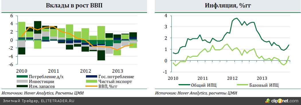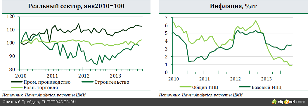 Инфляция в декабре составила 0,5%мм, 6,5%гг, повторив ноябрьский уровнь. Таким образом, по итогам 2013 года рост потребительских цен превысил целевой ориентир ЦБ на 2013 год (5-6%). Позитивным моментом стало замедление роста цен на продовольствие относительно неурожайного 2012 года. С учетом сезонности цены выросли на 0,4%мм, также как и в декабре 2012 года. В ноябре и октябре 2013 года рост цен на продовольствие в два раза превышал уровень соответствующих месяцев 2012 года, что послужило главной причиной ускорения инфляции в 4 кв 2013. В декабре ускорился рост цен на услуги (0,6%мм, 8%гг после 0,2%мм, 7,9%гг в ноябре), который в основном был обусловлен серьезным повышением цен на пассажироперевозки (+3,4%мм, 8,9%гг). БИПЦ в декабре составил 0,4%мм, 5,6%гг. Мы считаем, что можно ожидать существенного замедления инфляции в 2014 г. Во-первых, мы ожидаем, что влияние удорожания плодоовощной и молочной продукции и цен на яйца было временным и себя уже практически исчерпало. Во-вторых, замедление инфляции будет обеспечено заморозкой тарифов для промышленности и ограничением роста тарифов ЖКХ для населения. В-третьих, из-за ожиданий замедления роста потребления давление на цены со стороны спроса будет падать. Мы верим, что в отсутствии случайных негативных факторов, достижение цели ЦБ по инфляции на 2014 г. (5%гг) вполне реалистично. Росстат подтвердил оценку роста ВВП в 3 кв. 2013 г. на 1,2%гг, за январь- сентябрь – на 1,3%гг. По оценкам ЦМИ, квартальный рост ВВП с учетом сезонности составил 0,4%кк. Основным драйвером роста по-прежнему остается потребление домохозяйств (2,6 п.п.), которое, благодаря сохраняющимся высоким темпам роста доходов населения (2,7%гг в 3 кв. 2013 г.) и розничного кредитования (32,4%гг за 3 кв. 2013 г.), выросло в 3 кв. 2013 г. на 3,9%гг. Благодаря возобновлению уверенного роста экспорта (6%гг в 3 кв. после 4,1%гг во 2 кв., в основном за счет экспорта газа), поддержку росту экономики оказал внешний сектор (0,8 п.п.). Государственное потребление осталось практически неизменным (0,1%гг), обеспечив нулевой вклад. Причиной низких темпов роста экономики в целом по-прежнему выступает снижение инвестиций как в основной капитал (-0,2 п.п.), так и в запасы (-2 п.п.). Тенденция вялого роста экономики и слабой динамики инвестиций сохранилась и в 4 кв. Мы ожидаем, что рост экономики по итогам 2013 г. не превысит 1,3-1,5%гг. Индекс PMI обрабатывающих отраслей в декабре снизился до 48,8 (49,4 в ноябре), указав на самое существенное с декабря 2009 г. ухудшение деловой активности в секторе. Согласно HSBC, новые заказы вследствие продолжающегося ослабления экспортного спроса сократились до 28- месячного минимума (с учетом сезонности). Рост производства также остался крайне слабым, а зафиксированное существенное сокращение производства инвестиционных товаров подрывает надежды на скорое восстановление инвестиционной активности. На этом фоне компании обрабатывающего сектора значительно сократили закупочную активность (максимальные темпы падения с мая 2009) и численность занятых (максимальные темпы падения с августа 2009). Индекс PMI сферы услуг, напротив, увеличился в декабре на 0,7 п.п. до 53,6, но остается существенно ниже долгосрочного среднего исследования (56,1). В секторе сохраняется умеренный рост новых заказов и продолжается постепенное сокращение занятости. Однако деловые ожидания на 2014 продолжили ухудшаться. Только около трети компани
