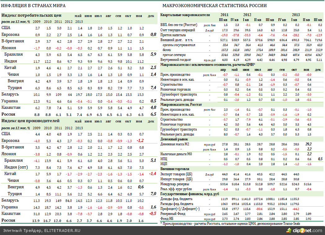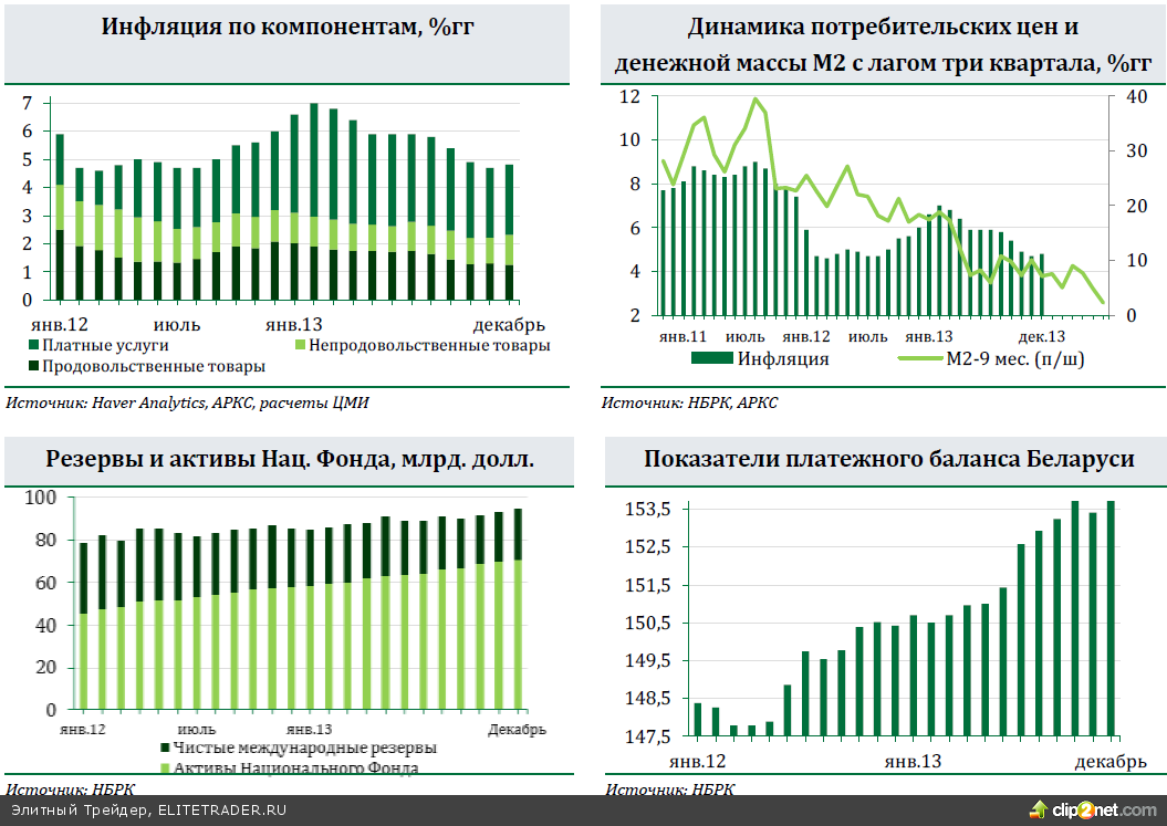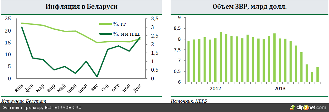 СОСЕДИ: В Украине инфляция в декабре ускорилась до 0,5%гг; ЗВР выросли за счет транша из России; динамика платежного баланса остается слабой. В Беларуси в 2013 инфляция ускорилась до 16,5%гг. Высокий спрос на наличные доллары подогревает девальвационные риски. В Казахстане инфляция в 2013 г. 4,8%гг; объем чистых ЗВР в декабре увеличился, но остается низким.