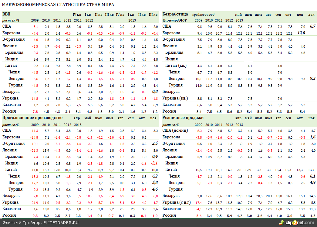 РОССИЯ: Инфляция в декабре составила 0,5%мм, 6,5%гг, по итогам года ожидаемо превысив целевой ориентир ЦБ на 2013 г. Основной вклад в рост экономики продолжает вносить потребление домохозяйств, которое в 3 кв. поддержал уверенный рост экспорта. В декабре индексы PMI указали на продолжающееся ухудшение деловых ожиданий.