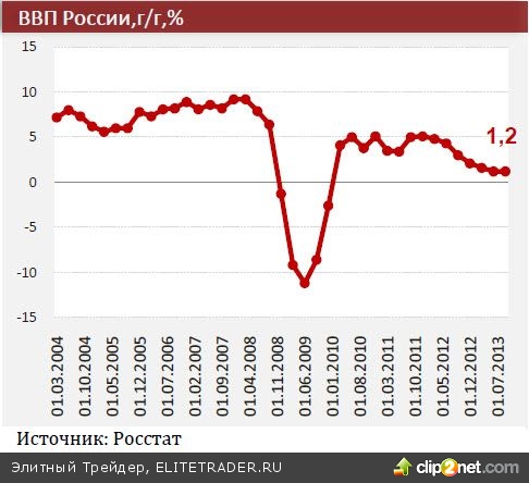 Долгожданного ускорения роста ВВП России во втором полугодии 2013 года не произошло. За первые три квартала 2013 года увеличение показателя составило всего 1,2% - в два раза меньше чем в предыдущем году и в четыре раза меньше чем в 2011. Минэкономразвития в третий раз за год поменял прогноз экономического роста, который по итогам четырех кварталов должен составить 1,4% (первоначальный сценарий составлял рост на 3,5%). В новом году министерство ожидает более перспективных 2,5-3%, однако, менее оптимистично выглядят прогнозы международных организаций - Всемирный Банк и МВФ в декабре сократили прогнозы роста экономики России на 2014 год до 2,2% и 2% соответственно.