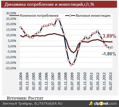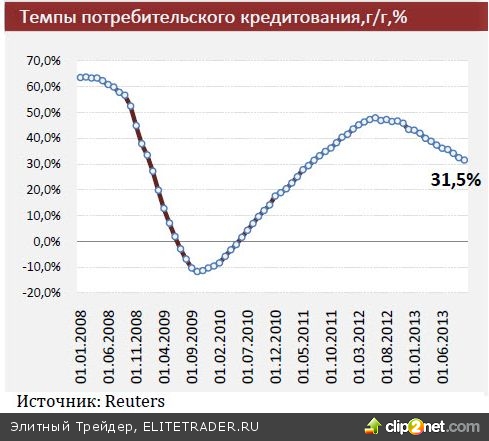Сохранять небольшой прирост ВВП позволяет относительная стабильность конечного потребления. По итогам 2013 года, скорее всего, мы увидим увеличение показателя в районе 4%, что лишь на 0,5% меньше чем год назад. Признаки оживления демонстрируют розничные продажи, которые в конце осени достигли годового прироста на 4,5%, что близко к максимальным уровням прошедшего года. Тем не менее, потребительское кредитование как драйвер роста выглядит исчерпавшим себя - за последние полтора года темпы годового увеличения показателя снизились с 50% до 31%.