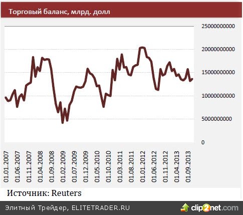 В конечном ВВП большую роль в поддержки экономики во втором полугодии сыграл рост экспорта на 5,4%. Тем не менее, в долларовом эквиваленте объем внешней торговля демонстрирует стагнацию, а прибавка к ВВП была во многом обеспечена девальвацией рубля летом 2013 года. В свете задач сдерживания инфляции в рамках 5% и предотвращения социального недовольства слабой национальной валютой этот ресурс стимулирования экономики в 2014 году будет ограничен. Внутренний спрос удовлетворяется в основном за счет импорта, динамика роста которого, в первый половине года оказалась лучше экспорта. В результате, сальдо торгового баланса по последним октябрьским данным сократилось до минимума с конца 2011 года (13,1 млрд. долларов).