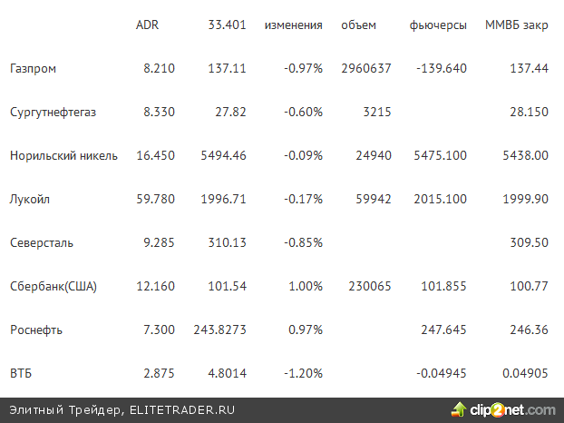 Российские ADR в Нью-Йорке упали (индекс Блумберга) на -0.2%. Лидировали в росте Мечел (+3.59%), Сбербанк (+1%), Русгидро (+0.65%). Лидировал в падении Газпром (-0.97%)..Market Vectors Russia ETF вырос +0.51%.