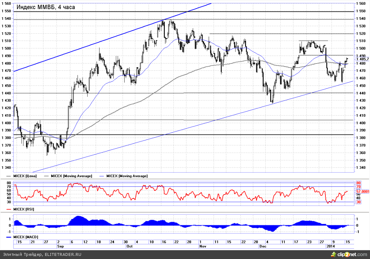 Что касается российского рынка акций, то, на мой взгляд, в данный момент дальнейший рост выглядит очень вероятным. В случае закрепления рынка выше 1490 пунктов по индексу ММВБ, далее цели передвинутся в район 1540-1550п. Продолжаем держать длинные позиции по рынку в целом. Беспокоиться за открытый лонг будем лишь по факту провала ниже 1450, чего пока не ожидается.