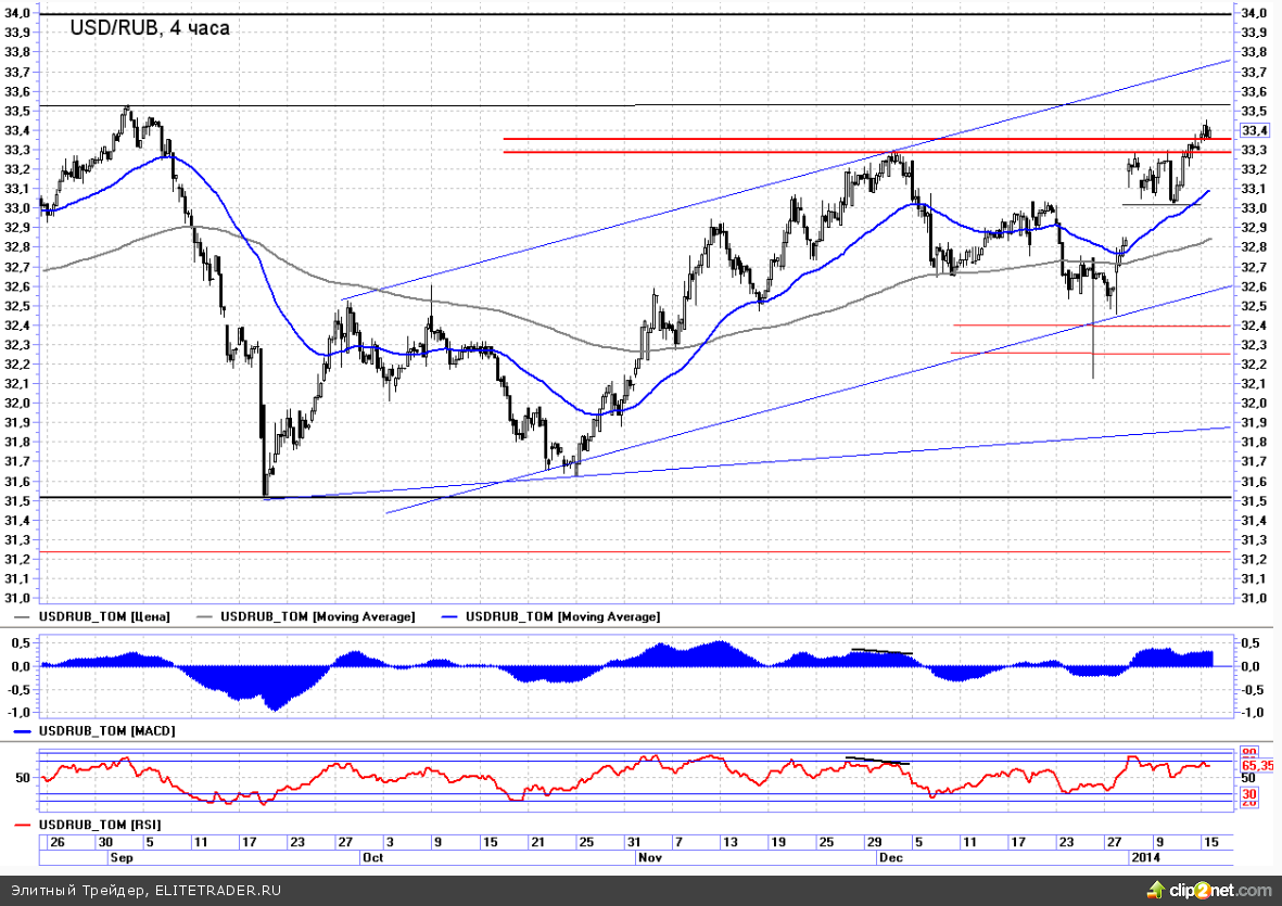 Российский рубль сейчас выглядит очень слабо. В среду курс USD/RUB вплотную подошел к максимумам 2013 года, приблизившись к отметке 33,5. Если не брать в расчет этот экстремум, то в качестве следующего целевого уровня сопротивления выделяю отметку в 34 рубля за доллар. Бивалютная корзина в это же время также продолжает устойчиво дорожать и обновлять максимумы с 2009 года.