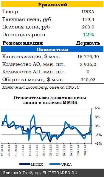 Наша оценка справедливой цены акций «Уралкалия» на конец 2014 года составляет 200 рублей, рекомендация – ДЕРЖАТЬ.
