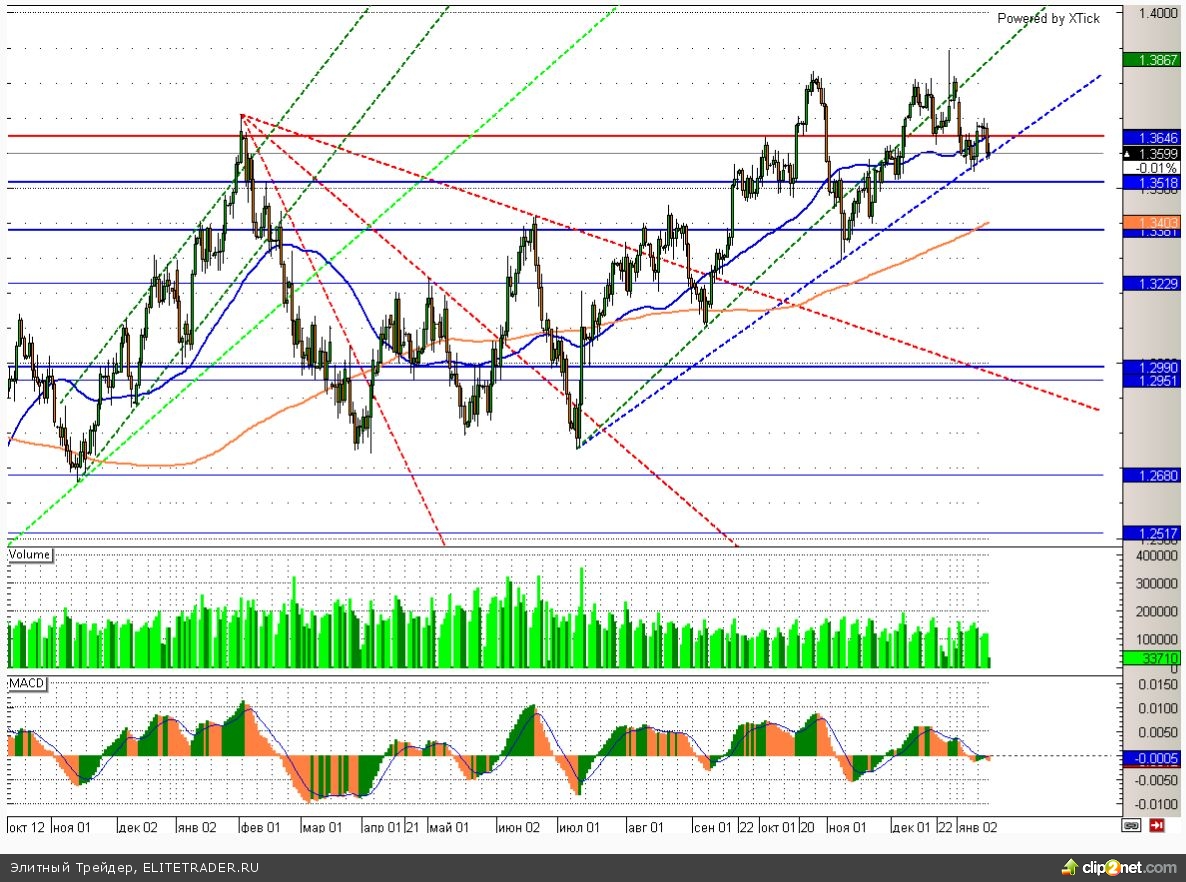 Евро снижается сегодня на 0,01% по отношению к доллару. Европейская валюта снова подобралась к восходящей трендовой линии и теперь консолидируется в ожидании новых драйверов. Ближайшая поддержка у данной валютной пары располагается на отметке 1,36 и в случае ее пробоя пара может упасть в район 1,34.