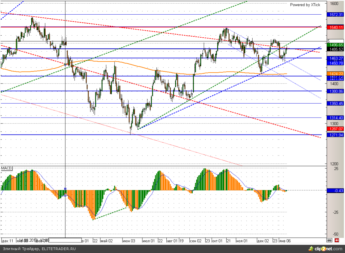 Российский рынок сегодня не демонстрирует сильной динамики и торгуется вблизи вчерашних уровней. Данная динамика обусловлена отсутствием важных новостей в первой половине дня, а также достижением значимых психологических уровней многими фондовыми активами. В частности ММВБ сегодня добрался до уровня 1490. Именно здесь располагается нисходящая трендовая линия, пробить которую без дополнительных драйверов будет крайне сложно.
