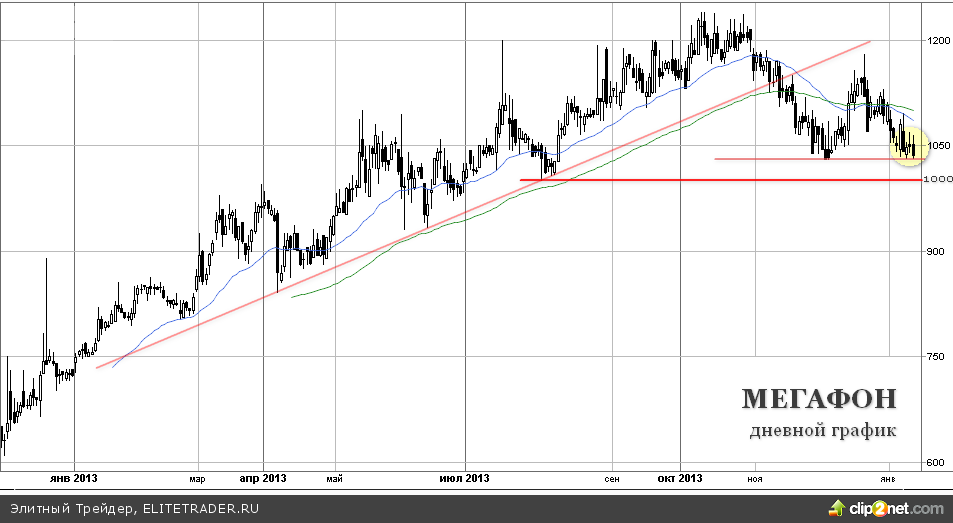 Вторая часть плана: спекулятивные «лонги» (напомним, что «шортить» бумаги Мегафона пока нельзя). На подходе к уровню 1000 рублей спекулятивные покупки могли выглядеть устрашающими на фоне декабрьского падения, однако общий оптимизм и минимальные риски позволяли открывать позиции чуть выше указанной зоны.