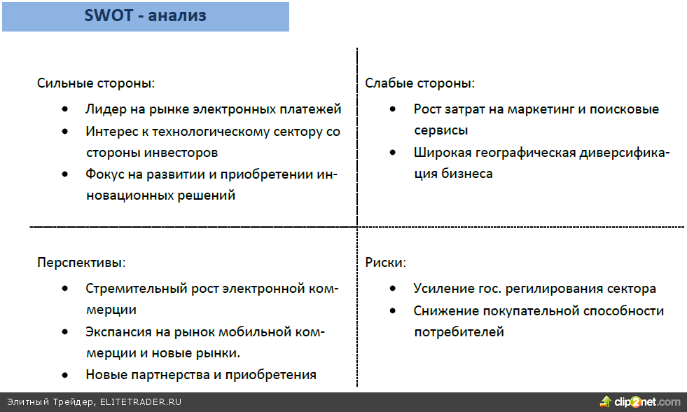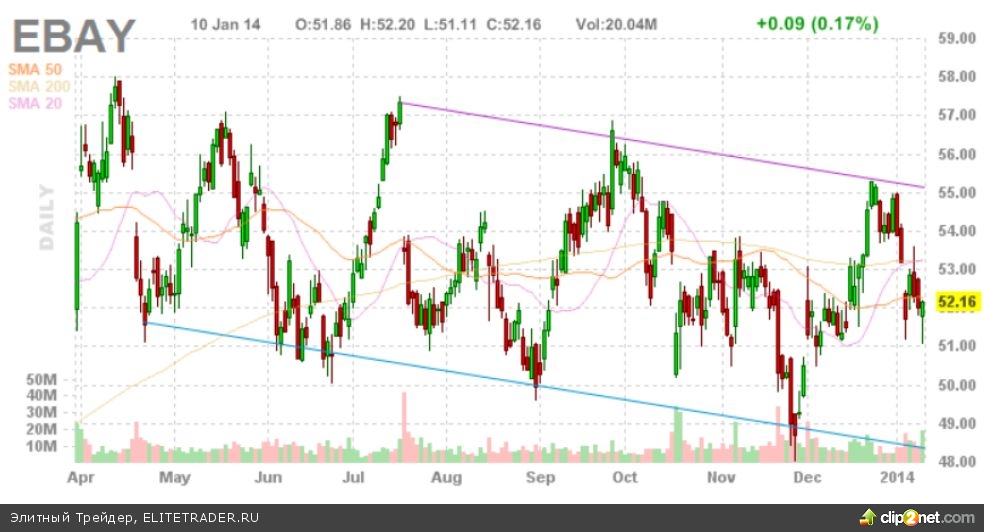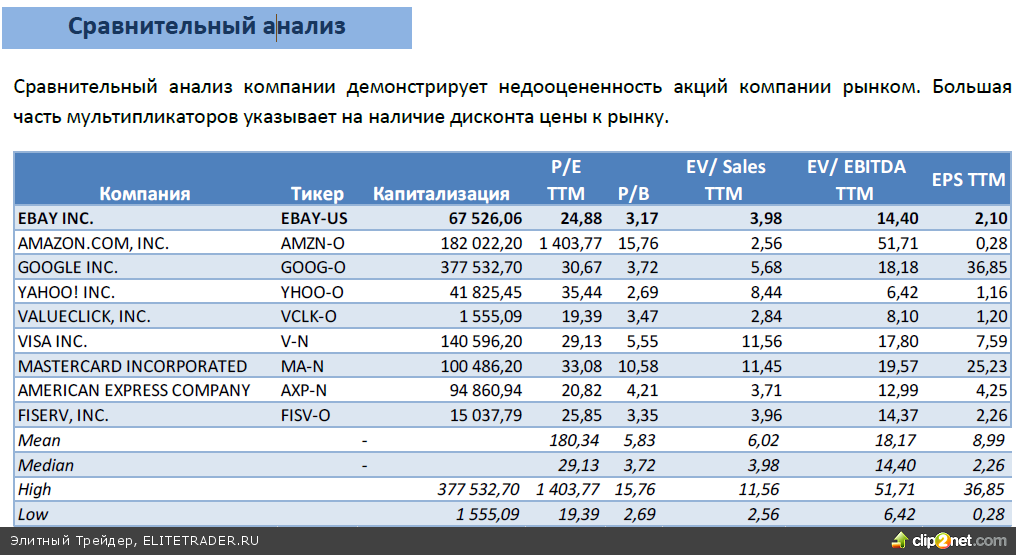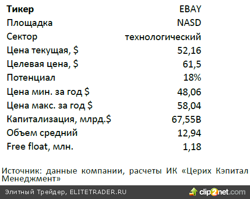 eBay Inc. (eBay) представляет собой меж-дународную коммерческую платформу. Бизнес компании позволяет миллионам людей покупать, продавать и платить он-лайн. Компания – лидер рынка интернет-аукционов и платежных сервисов. Основные финансовые потоки компании приходятся на американский рынок. Одним из основных драйверов роста мо-жет стать возможное начало обратного выкупа акций в 2014 году. Основной риск – снижение покупательной способности населения. Сравнительный анализ компании демон-стрирует наличие дисконта цены к рынку. Акции компании имеют среднесрочную цель в районе $61,5 за акцию, рекоменду-ем рассмотреть возможность покупки акций компании в портфель.