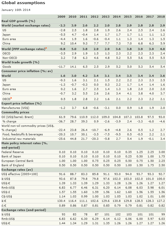Американская экономика делала успехи в 2013 году: существенно выросли потребительские расходы, инвестиции в бизнес и экспорт. Хотя рост занятости снизился в декабре, что мы связываем в основном с погодой, рост ВВП, вероятно, приблизился к 3% в четвертом квартале в годовом исчислении, толкнув американский рост во втором полугодии 2013 к впечатляющим 3.5% в годовом исчислении, таким образом, это лучший показатель за девять лет. По этим причинам аналитический отдел The Economist повышает оценку роста реального ВВП на 2013 года до 1.9% с 1.7%. В данный момент мы сохраняем наш прогноз на рост в 2014 году на отметке 2.6%, хотя есть вероятность повышения.