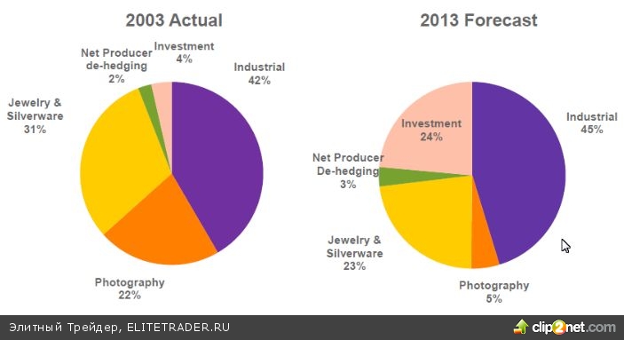 На долю двух данных компонентов спроса приходится около 67% от объема совокупного мирового потребления серебра, поэтому цены не могут не отреагировать на позитив, идущий из промышленности и ювелирного дела. Тем более что Всемирный банк повысил прогнозы роста мировой экономики на 2014 год до 3,2%, на 2015-й — до 3,4%, а на 2016-й — до 3,5%. По сравнению с 2,4% в прошлом году цифры выглядят очень неплохо.