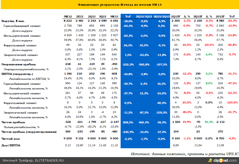 По итогам 9М13 компания демонстрирует 19%-е снижение выручки, операционный убыток в почти $400 млн и чистый убыток в почти $2,25 млрд. Однако, если исключить неденежные убытки, отраженный в результате продажи неэффективных предприятий, ситуация будет выглядеть куда менее драматичной. Скорректированная EBITDA за 9М13 снизилась более чем вдвое, но осталась на уверенно положительной территории. Скорректированный чистый убыток не превысил $500 млн, которые связаны преимущественно с обслуживанием долга, причем по итогам 3К13 убыток сократился более чем вдвое на фоне 2К13. Мы ожидаем, что эта тенденция продолжится, и по итогам 4К13 компания получит скорректированный чистый убыток/прибыль в районе нулевой отметки.