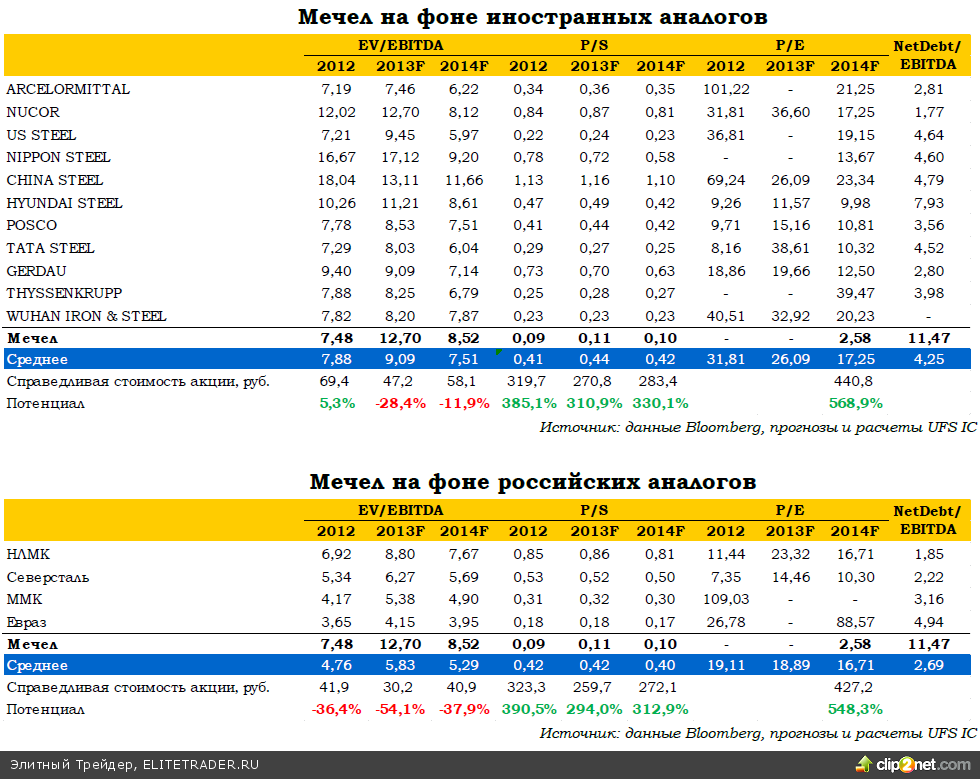 На наш взгляд, самое тяжелое время для «Мечела» уже позади. 2014 год должен стать переломным для металлургической отрасли, мы ожидаем, что в течение этого года будет заложено основание для восходящего тренда в котировках основных сырьевых товаров. В этих условиях текущие ценовые уровни бумаг «Мечела» выглядят неоправданно низкими. Подтверждаем рекомендацию ПОКУПАТЬ.