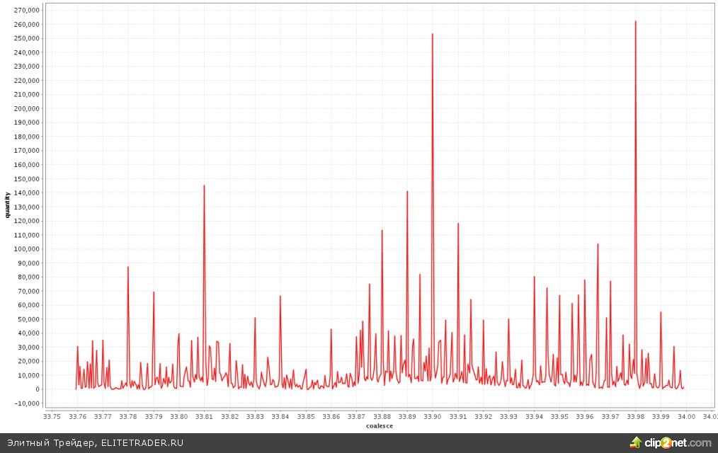 Далее перейдем на валютный рынок. Здесь сегодня не пощупали психологические 34 рубля за 1 доллар США. Максимум дня зафиксирован в районе 33,994 руб. Речь об инструменте USDRUB_TOM. Хотя взбудораженные товарищи мне днем писали в Скайп об уровне 34 рубля. Ну не было его сегодня. Началась старая игра с ровными числами. 34 рубля — очень красивый уровень. Пофронтраннят и его. Но есть основание думать, что быстро отсюда не развернут. Будет проторговка. Давайте вспомним, как развернулись покупатели от 33 рублей. Набрали точечный объем 400 млн. долл. США по 33,1 руб. Наверное, перед существенным откатом доллара должно произойти что-то схожее.