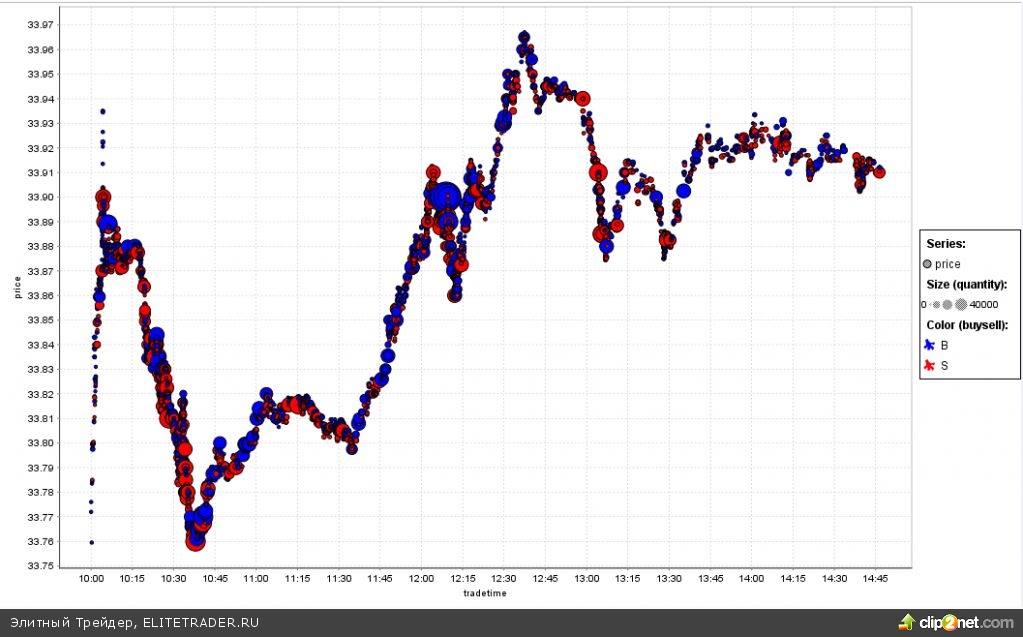 Все началось с утреннего шипа. Задерг вверх и резкий удар в обратную сторону. Потом в 12 часов прошел всплеск объема в размере 31 тыс. контрактов за пару минут торгов. Естественно, это не аномалия. Просто крупная активность. Внутри дня эти локальные всплески объема выглядели следующим образом: