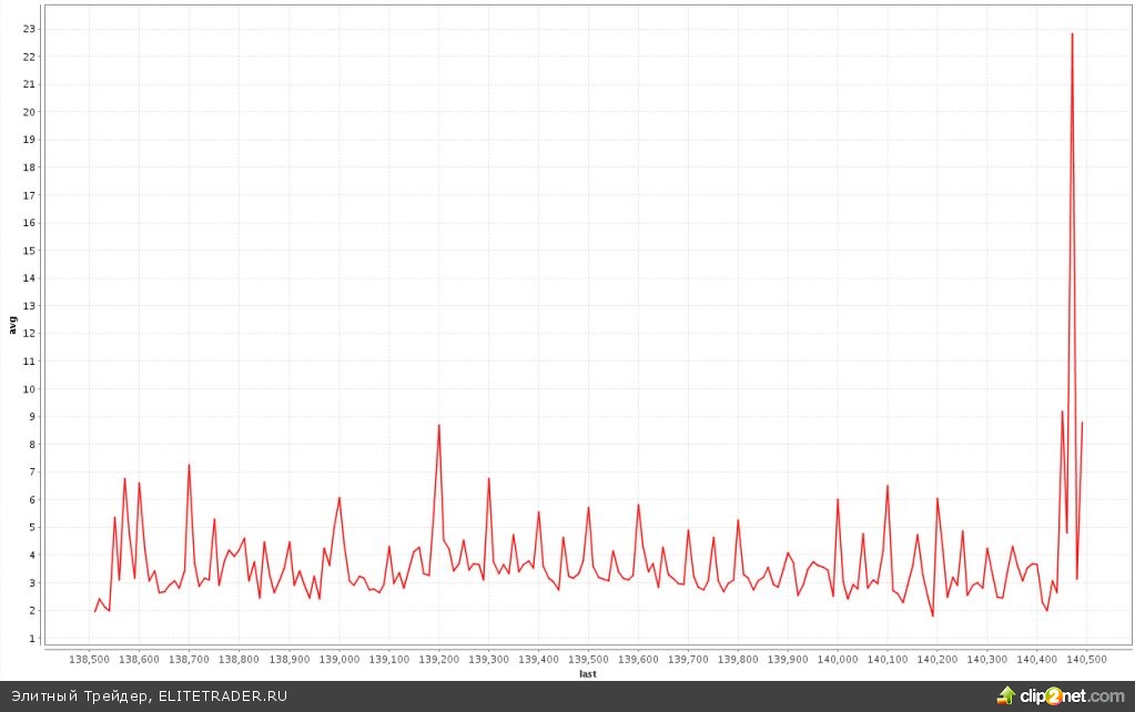 Давайте взглянем, где у нас была самая крупная средняя сделка во фьючерсе на индек РТС внутри дня (это параметр рассчитывается как среднее арифметическое тиковых объемов на каждом шаге цены за торговый день):