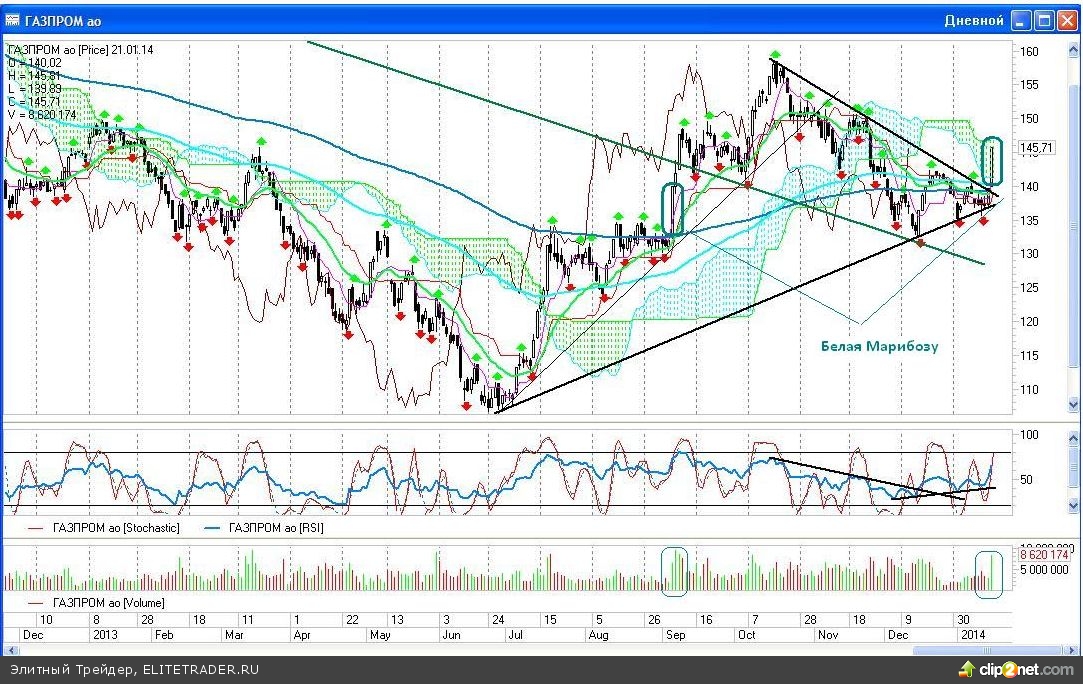 Хочу отметить тот факт, что наличие такой сильной свечи, как вчера, существенно повышает шанс на рост данной акции и далее. Во-первых, потому что взят максимум фигуры, расположенный на уровне 142,48 рублей; во-вторых, подтвержден пробой нисходящего тренда (см. на обороты торгов, они впечатляют); и наконец, сама вчерашняя свеча это белая «Марибозу». Появление такой свечи в начале движения обычно сигнализирует лишь о серьезности «быков».