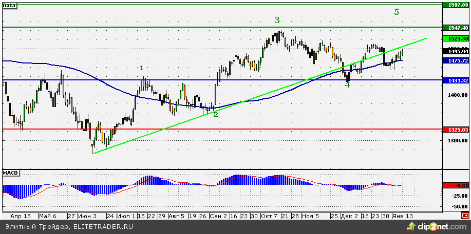 Позитивный сценарий предполагает, что сейчас мы наблюдаем 5 волну импульсной волны большего порядка и закончится она, вероятно в районе 1550. Первое сопротивление на пути реализации данного сценария располагается на отметке 1505 и если она будет преодолена, то это и станет толчком к реализации данного сценария. Вариантом отмены сценария станет уход ниже 1430.