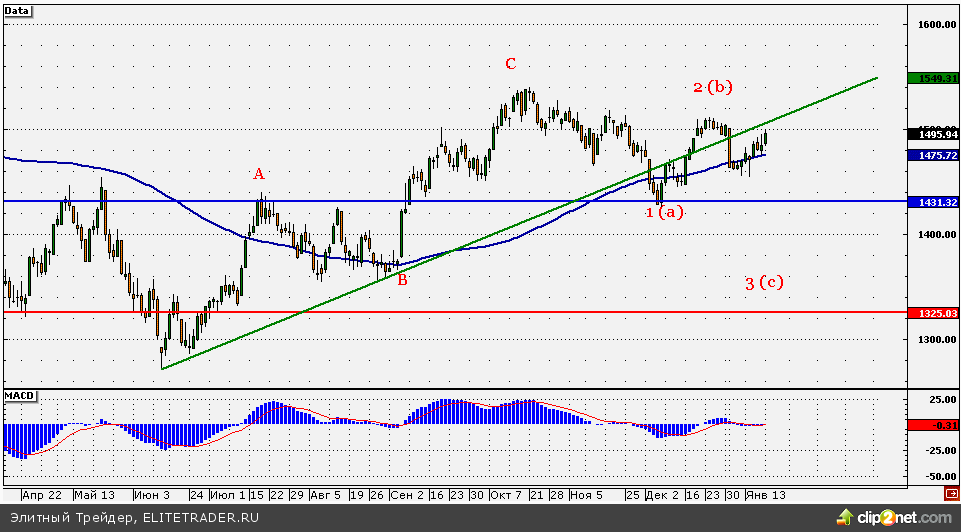 В свою очередь негативный сценарий предполагает, что в текущий момент идет формирование волны С (или волны 3, если это движение не коррекционное, а импульсное). Цель этого движения располагается в районе 1340, а сигналом к реализации станет уход ниже 1430.