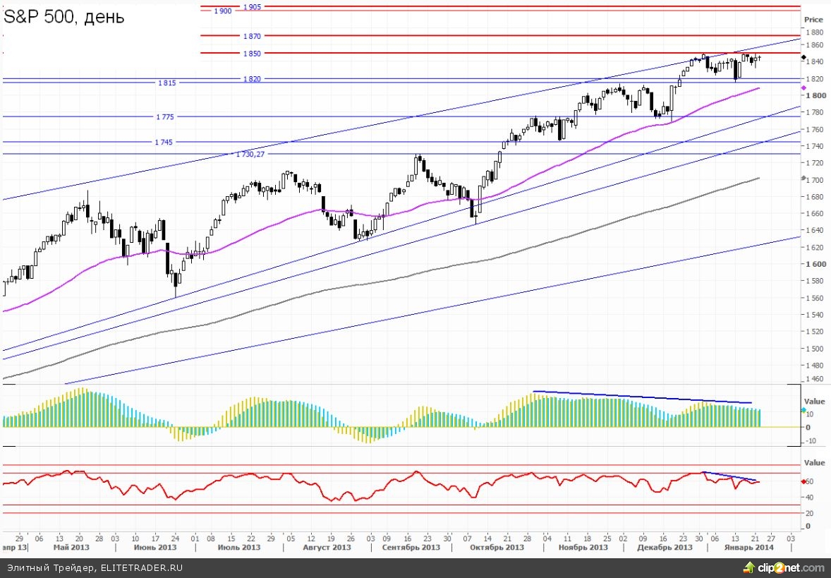 В среднесрочной перспективе очень многие эксперты по-прежнему склоняются к тому, что вскоре нас ждет очень масштабная распродажа на американском рынке. Кто-то даже говорит о схожести текущей ситуации с 1987 годом и приводит в пользу этого множество оправданных обоснований. Соотношение быков и медведей среди различных классов инвесторов в данный момент находится чуть ли не на исторических максимумах - толпа смотрит исключительно наверх. Я в свою очередь склонен согласиться с тем, что действительно в ближайшее время мы станем свидетелями очень масштабного снижения. Никакой фундаментальной причины (ФРС и прочее) для этого не нужно. Длинные позиции на американском рынке в целом необходимо закрывать, так как риск нарваться на очень серьезный провал сейчас несопоставим с оставшимся потенциалом роста. В своих обзорах по ТА уже много раз выделяли области 1850 и 1870-1875 (достижение 1900-1905 пока держим в голове, но на этот подвиг сил, скорее всего, уже не хватит) в качестве ориентиров, после достижения которых up-тренд начнет ломаться. Подобный взгляд на ситуацию сохраняется. Если в самой ближайшей перспективе не удастся запрыгнуть выше 1850, то начнем падать прямо отсюда, и текущие уровни станут максимумами на очень долгий период.
