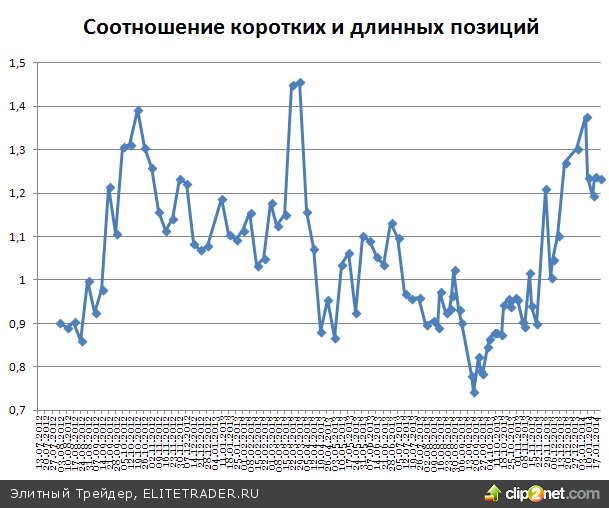 Обратив внимание на открытые юридическими лицами позиции по фьючерсу на индекс, можно заметить, что настроения крупных игроков за прошедшие несколько дней практически не изменились и продолжают смотреть в сторону продаж. Соотношение коротких и длинных позиций сейчас составляет 1,232 против 1,238 в прошедшую пятницу.