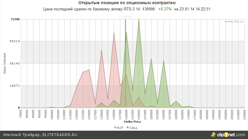 Между тем открытые опционные позиции по RIH4 со сроком исполнения 16.02.14 сейчас также смотрят на продажу. Максимальное количество открытых опционов колл расположилось уже на уровне 140000, что буквально через 500 пунктов от текущего уровня и говорит о сильном сопротивлении на этой отметке. При этом максимальное количество открытых позиций по опционам пут находится лишь в районе 135000.