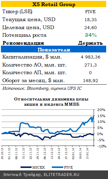 На фоне слабых результатов «Магнита», отчетность Х5 выглядит вдвойне сильной, и будет стимулировать переток инвесторов из бумаг краснодарской сети. За прошедший год сеть справилась с основными вызовами, и в 2014 году мы ожидаем увидеть сохранение достигнутых результатов и развитие позитивных тенденций. Мы подтверждаем оценку справедливой стоимости компании на уровне $24,6 за бумагу. Негативные факторы, которые препятствовали реализации потенциала, по большей части исчерпаны. Рекомендация ПОКУПАТЬ