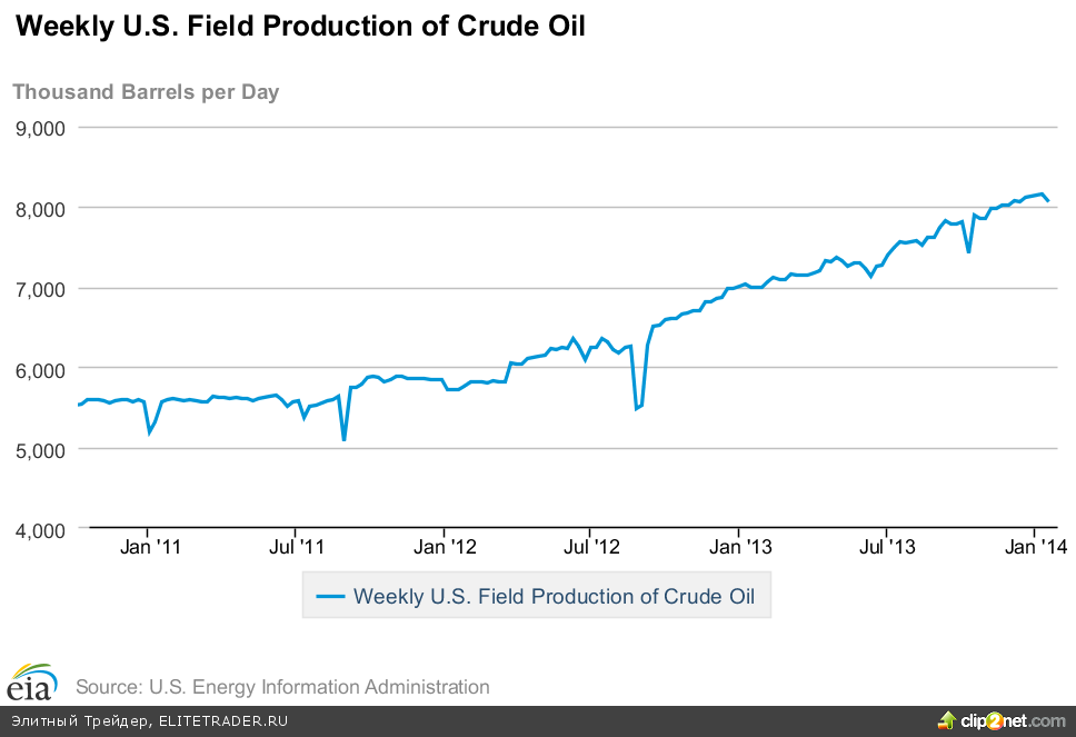 Согласно полученным данным, добыча в США немного сократилась и в данный момент составляет 8,052 млн. баррелей в день.