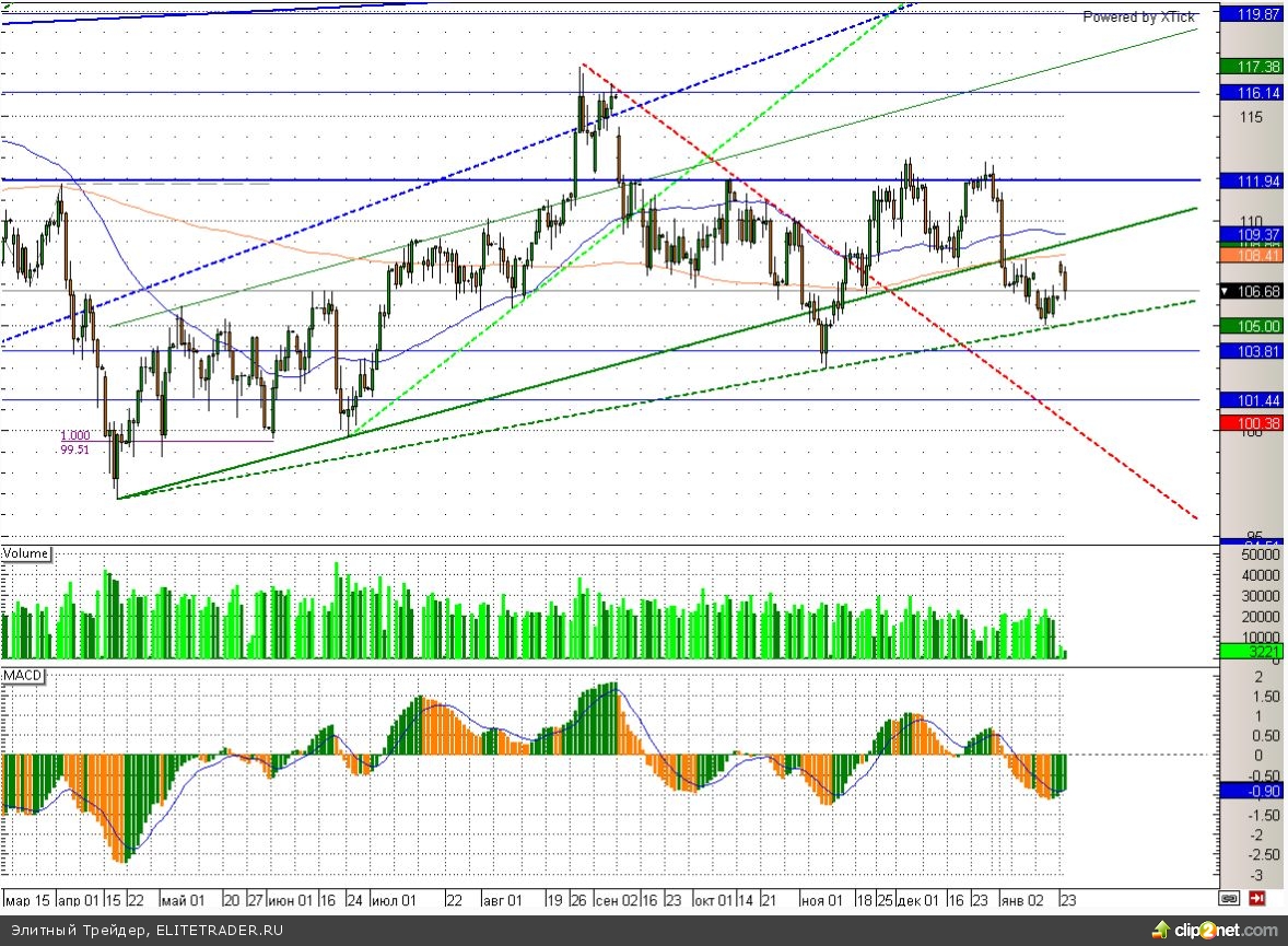 В свою очередь нефть сорта Brent сейчас находится на перепутье. Ближайшая поддержка в виде растущей трендовой линии и отметки 105 еще достаточно далеко, как и сопротивление, находящееся в районе 109 долларов за баррель. Соответственно сигнал этот поводырь дает практически нулевой.