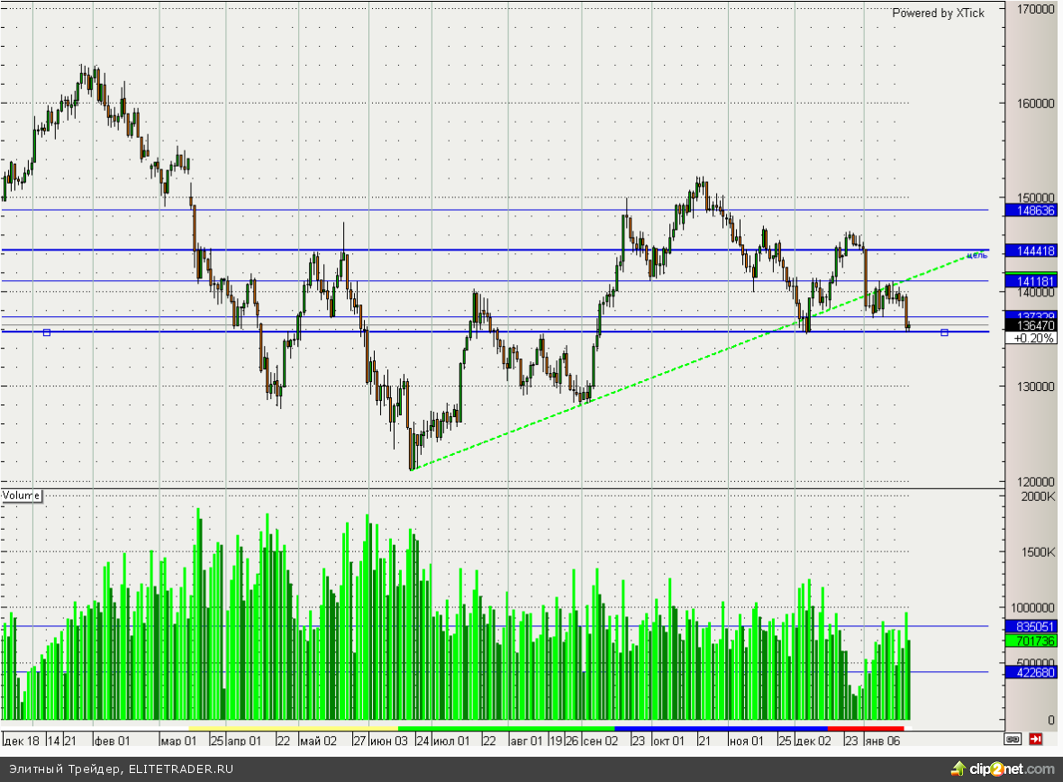 Фьючерс на индекс РТС сегодня торгуется на отрицательной территории и пока никак не может оправиться от еще утренних потерь. Канал 137500 – 141000 был ожидаемо, пробит вниз, но цели этого движения уже практически достигнуты. Текущие уровни могут стать вполне привлекательными для покупок, особенно учитывая достижение минимальных значений с декабря прошлого года.