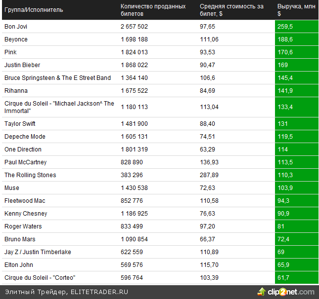 Совокупная выручка 20 представленных концертных туров составила $2,43 млрд, что на $470,6 млн, или 24%, больше по сравнению с аналогичным показателем, зафиксированным в прошлом году. Более того, 50 крупнейших концертных туров в 2013 г. принесли исполнителям $3,8 млрд по сравнению с $2,9 млрд в прошлом году.