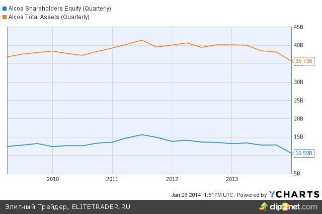 За этой компанией давно наблюдал и наблюдаю. Не буду особо углубляться в дебри анализа, а лишь факты которые на сегодняшний день существуют и некоторые оценки и взгляды. И так, компания сократила выручку на 5.31% по отношению к 4-ому кварталу 2012 года. Выручка за весь 2013 год сократилась на 2.82% по отношению к 2012 году. Основной причиной падения выручки – падение стоимости алюминия на 7%. Что касается прибыли, то Alcoa показала убыток $2.19 на акцию или 2,339 млн. долларов. Основной статьей, которая привела к убыткам, стала статья “non-cash goodwill impairment”. Обесценивание Goodwill произошло за счет приобретений компании Alumax Inc. в 1998 и Reynolds Metals Company в 2000, и связано все так же с падением цен на первичный алюминий, снижение операционной маржи и увеличения ставок дисконтирования. Потери по данной статье составили 1,731 млн. долларов. Если данную статью исключить из расчетов, то потери в четвертом квартале составили бы $0.05 на акцию и общая прибыль за 2013 год $0.05 на акцию.