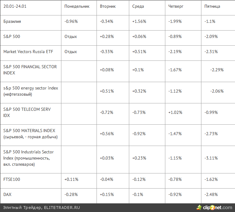 Российские ADR в Нью-Йорке 24.01 упали (индекс Блумберга) на -3.32%. Лидировали в падении Сбербанк (-4.76%), Русгидро(-4.24%), Мечел (-3.35%), МТС (-3.34%),Лукойл (-2.58%), Ростелеком (-2.05%), Норникель (-1.82%),Сургутоб (-1.1%), Сургутпреф(-0.66%) Вырос Газпром (+0.24. Market Vectors Russia ETF упал -2.31%.