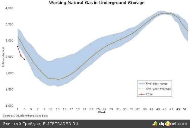 Природный газ (NGG4) стал лидером роста среди сырьевых товаров вторую неделю подряд, подорожав почти до пяти долларов за терм. Этот уровень был несколько раз протестирован, но не пробит в 2010 и 2011 годах. В связи с аномально холодной погодой в США спрос на газ увеличился настолько сильно, что запасы сократились до минимального с 2005 года уровня для этого времени года. В подземных хранилищах страны сейчас находится около 2423 миллиардов кубических футов газа, что на 12% меньше пятилетнего среднего значения. Еженедельное извлечение запасов вплоть до окончания сезона потребления в конце марта может привести к тому, что объемы уменьшатся до тревожных уровней, и это вызвало рост цен в последние недели. Восходящий потенциал остается довольно сильным, но резкое изменение погодных условий может привести к фиксации прибыли в значительном объеме.