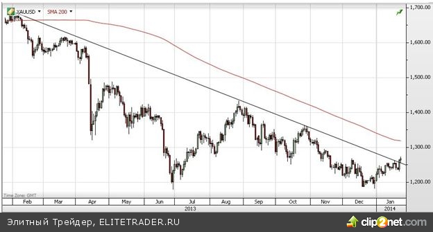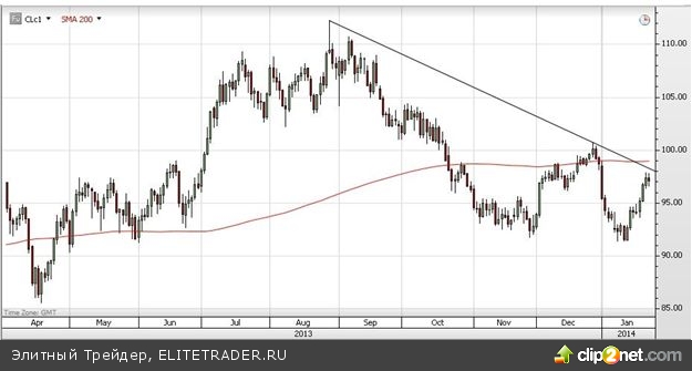 Сырая нефть сорта Brent (LCOH4) уступила по динамике нефти марки WTI, в результате чего разница между двумя основными мировыми смесями снова стала меньше на 10 долларов — впервые с начала ноября. Увеличение предложения из Ливии и потенциальное замедление экономики Китая способствовали продажам нефти Brent, в то время как нефть сорта WTI получила стимул к росту благодаря новости о том, что компания TransCanada Corp запустила в эксплуатацию южный участок трубопровода Keystone XL пропускной способностью 300 000 баррелей в сутки. Это должно улучшить ситуацию с затовариванием в Кушинге (штат Оклахома), где находится пункт поставки нефти WTI по фьючерсным контрактам, торгуемым на Нью-Йоркской бирже. Под влиянием очень низкой температуры воздуха, установившейся на восточном побережье США, вырос спрос не только на природный газ, но и на мазут. Когда погода вернется в норму, цена на нефть WTI предположительно снова понизится на фоне высокого предложения, обусловленного непрекращающимся ростом добычи сланцевой нефти. Сопротивление будет возрастать по мере приближения к уровню 100 долларов. Линия тренда, построенная от августовского максимума на уровне 98,25, и 200-дневная скользящая средняя на уровне 99 могут остановить текущее ралли.