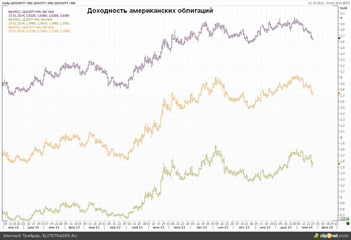 Куда же идут деньги в этих условиях? Известно куда, в американские облигации, которые вновь чувствуют себя крайне уверенно, и с начала января подорожали уже на 10% (10-летние бумаги), после нескольких месяцев роста их доходности.