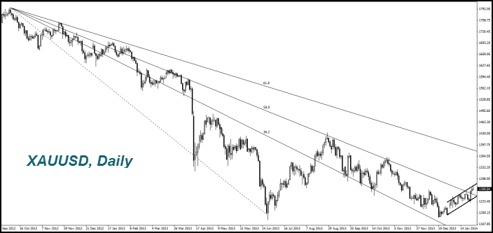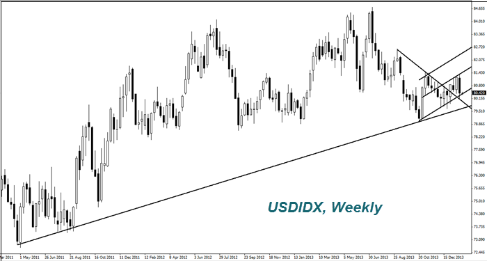 Впрочем, индекс доллара (USDIDX) заметно упал на прошлой неделе. По нашему мнению, часть инвесторов сомневается, что в эту среду ФРС действительно сократит выкуп гособлигаций еще на $10 млрд. в месяц. С первого февраля вместо Бена Бернанке новым главой ФРС будет Джанет Еллен. Мы полагаем, что если сокращение все же произойдет, индекс доллара может повыситься. Отметим, что сегодня в США выйдут данные по продажам новых домов за декабрь в 15-00 GMT (0). Предварительный прогноз является негативным. В 9-00 GMT (0) выйдет индекс деловой уверенности в Германии за январь. Ожидается его рост до 110 пунктов, третий месяц подряд. Это может поддержать курс евро.