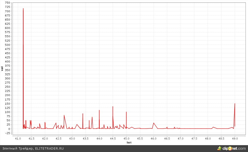 И шип вверх под закрытие дневной сессии пятницы. Однако с позиции накопленных объемов за 2 дня на том шипе существенного объема не было «проглочено». Основные торговые объемы пятницы-понедельника лежат в диапазоне между 39,5 и 41,5 рублями. Но все же посмотрим структуру того шипа покрупее, может, чего разглядим. Берем период с 18-30 до 18-45 прошлой пятницы и видим 2 тяжелых хвоста по 41,25 и 49 руб.:
