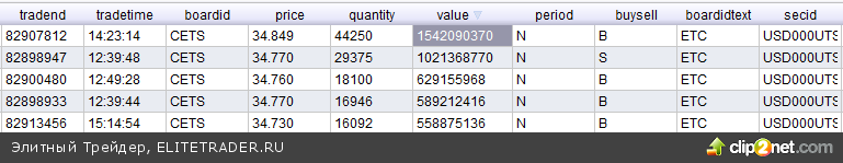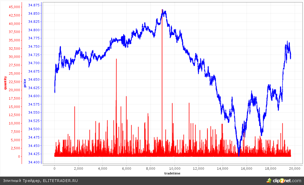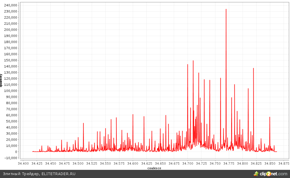 Последний раз текущие уровни мы лицезрели в апреле 2009 года. Тогда максимум доллара против рубля был на уровне 34,49 руб. Сегодняшний максимум был зафиксирован на отметке 34,86 руб. В этом абзаце есть повод соскочить на анализ внутридневных объемов. Ибо на отметке 34,84 руб. был крупный лот в размере 44 млн. долл. США. 1,5 млрд. руб. 1 сделкой нечасто такое увидишь. Конечно, эта сделка интересна лишь по одной причине — именно от нее доллар стал ослабевать по отношению к рублю внутри дня.
