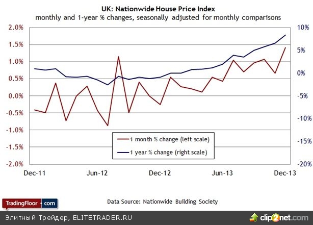 Между тем рынок жилья в Великобритании перегрет. В декабре цены, по данным Nationwide, подскочили на 1,4%, что стало самым высоким показателем месячного роста за последние четыре года. В годовом выражении цены в прошлом месяце выросли на 8% (максимальный результат с середины 2010 года). Повышение цен на жилье не представляло бы собой такую большую проблему, если бы положение экономики было неустойчивым. Но это не так. Уровень безработицы упал до 7,1%, а Карни сказал, что при достижении отметки 7% возникнет необходимость в обсуждении вопроса повышения процентных ставок.