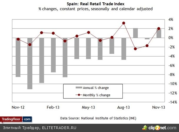 Но даже если результат сегодня будет высокий, ожидать быстрого разворота тренда пока преждевременно. Действительно, безработица в Испании по-прежнему достигает 26% и продолжает расти. Тем не менее, Международный валютный фонд отмечает улучшения. В опубликованном на прошлой неделе «Прогнозе развития мировой экономики» фонд сделал прогноз о том, что в этом году темпы роста ВВП Испании составят 0,6% по сравнению с октябрьской оценкой на уровне 0,4%. По этим меркам прогноз министра экономики кажется чересчур завышенным, если только данные о розничных продажах сегодня не укажут на обратное.