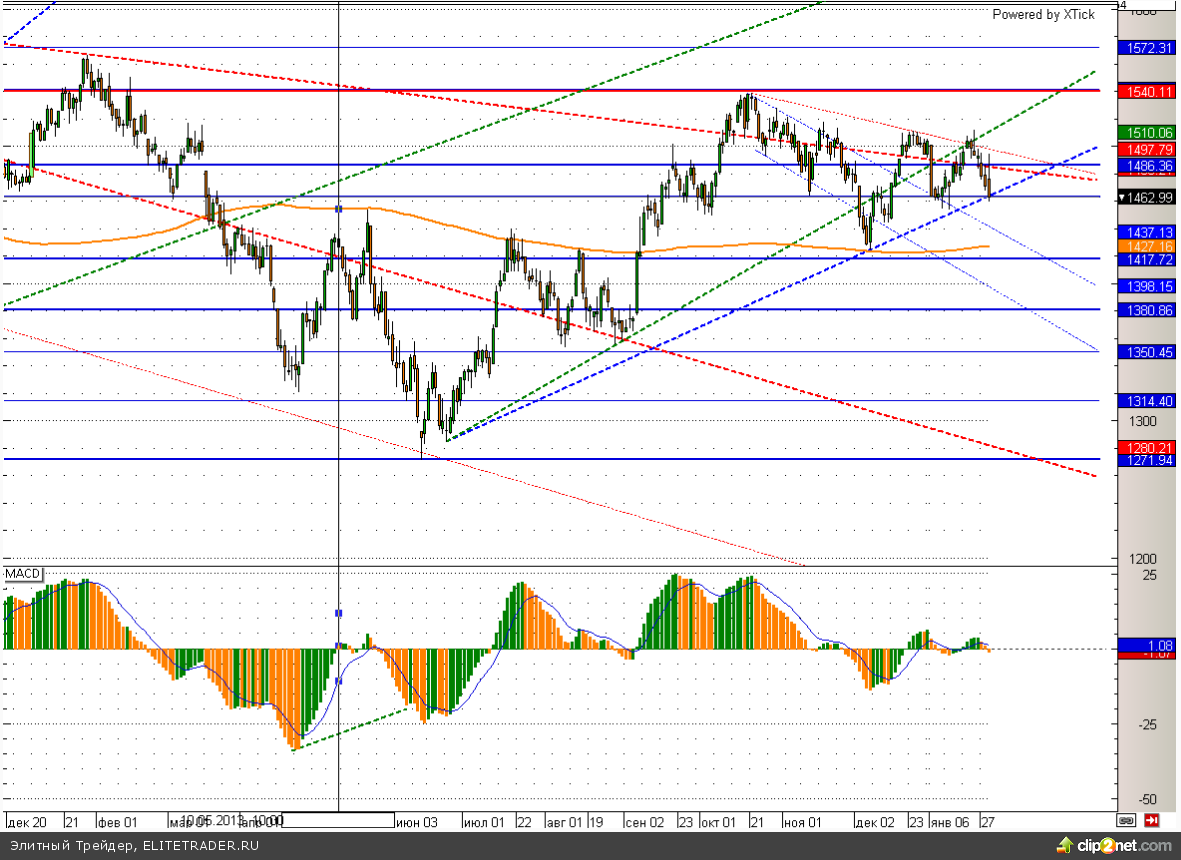 Российский рынок завершил сегодняшнюю торговую сессию значительным снижением. Индекс ММВБ потерял 0,45% и вплотную приблизился к восходящей трендовой линии. Данная линия, проходящая сейчас через уровень 1460, отделяет ММВБ от реализации модели двойная вершина и ускорения снижения. Ближайшей целью в этом случае может стать отметка 1435.